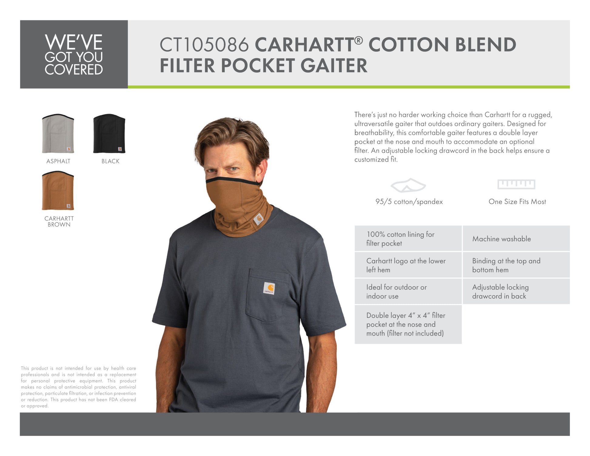 There’s just no harder working choice than Carhartt for a rugged, ultraversatile gaiter that outdoes ordinary gaiters. Designed for breathability, this comfortable gaiter features a double layer pocket at the nose and mouth to accommodate an optional filter. An adjustable locking drawcord in the back helps ensure a customized fit.